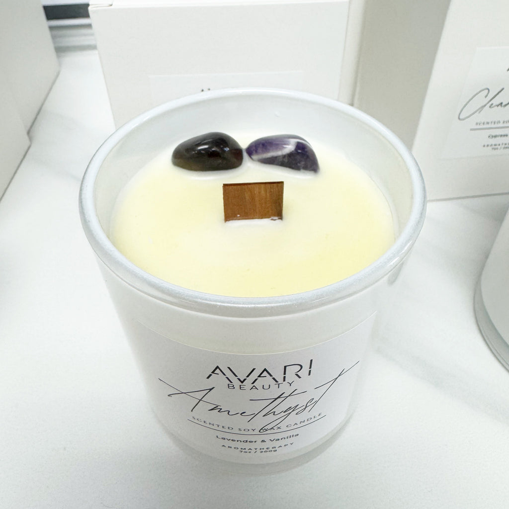 Crafted for deep relaxation, the Amethyst Scented Soy Wax Candle blends lavender and vanilla for a comforting, spa-like aroma. A genuine Amethyst crystal sits atop the candle, known for its calming and protective energy—perfect for evening rituals, meditation, or winding down.